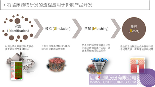 二、 功效成分篩選平臺(tái)。將臨床藥物研發(fā)的流程應(yīng)用于護(hù)膚產(chǎn)品開(kāi)發(fā),針對(duì)不同皮膚衰老問(wèn)題,建立集識(shí)別(Identification)、模擬(Simulation)、匹配(Matching)以及重設(shè)(Reset)為一體的I.S.M.R的流程。在此基礎(chǔ)上與分泌型天然多肽因子庫(kù)有機(jī)結(jié)合,目標(biāo)導(dǎo)向化高效篩選創(chuàng)新型多肽成分組合。